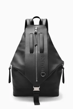 Unleash the full potential of your bag with the Loewe multi-functional backpack. • Crafted from calfskin, it seamlessly transforms from a backpack to a double handled holdall, thanks to the innovative branded metal buckle • The high-comfort padded straps and mesh back ensure comfortable carrying • The external zip pocket keeps your tablet secure . Colour: Black, Classic calfskin, Back, shoulder or top handle carry., Adjustable shoulder straps, Zip closure with calfskin zip pull, 2 zip side pockets, 1 large zip pocket, Herringbone cotton canvas lining, Embossed logo, D ring, Mesh back, Made in Spain Product Code: 217332574